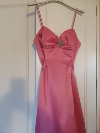 Elegante vestido largo para ocasiones especiales.Pone talla 36, pero es un 38 para un busto de talla 90 aproximadamente. - Color rosa vibrante. - Detalle de lazo en la cintura. - Tirantes finos. - Escote corazón con adornos.