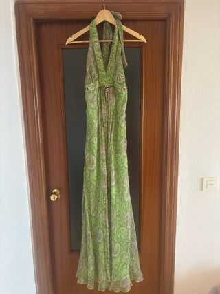 Elegante vestido largo con detalles de pedrería, ideal para eventos especiales. - Diseño con escote halter. - Estampado paisley en tonos verdes y morados. - Cuerpo drapeado con pedrería. - Falda larga y fluida. - Talla algo más pequeño