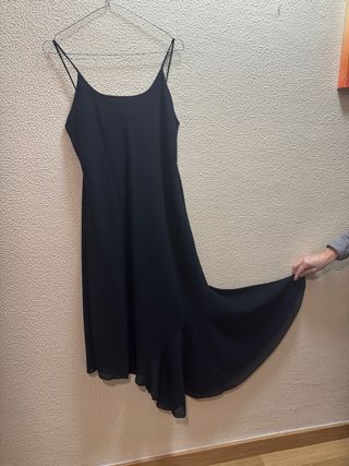 Elegante vestido negro largo con tirantes finos. Su diseño fluido lo hace ideal para ocasiones especiales como bodas, cenas y fiestas. Solo 2 usos. Cuidado y limpio. Talla 44. - Tirantes finos. - Diseño asimétrico en el bajo. - Tejido crepe ligero y vaporoso.