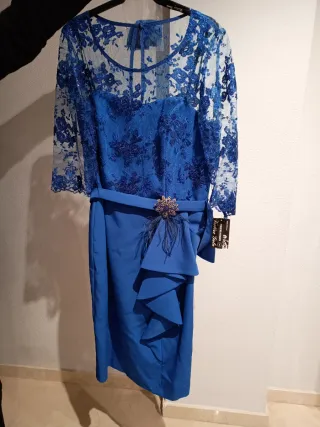 Elegante vestido de fiesta en tono azul vibrante, con detalles de encaje floral. - Cuerpo superior y mangas largas de encaje. - Fajín con detalle de broche y plumas. - Falda con volantes asimétricos.