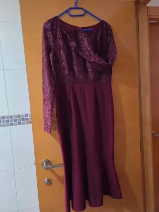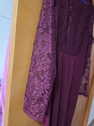 Elegante vestido de fiesta en color vino, perfecto para ocasiones especiales. Presenta un diseño sofisticado con detalles de encaje. - Manga larga. - Cuerpo de encaje. - Falda con vuelo.