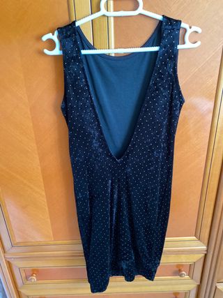Vestido mini en terciopelo negro con lunares pequeños dorados. Espalda al aire. Talla S de Zara Buen estado