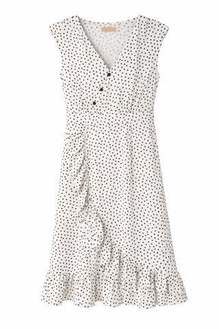 Vestido de fiesta con un elegante estampado de lunares y forro negro. Única puesta. Largo 90 cms. Entre hombros 38. - Diseño con cuello drapeado con 3 botones forrados. - Detalle floral en el hombro. - Manga corta. - Tejido ligero y vaporoso.