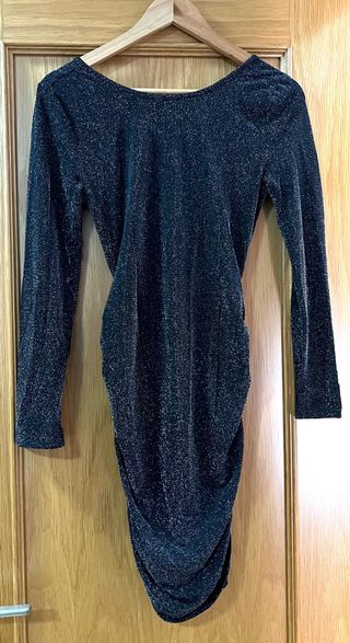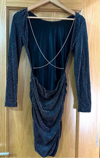 ✨ Vestido de fiesta brillante con espalda abierta ✨ Precioso vestido de fiesta en color negro con brillo sutil que estiliza mucho la figura. Tiene mangas largas y un diseño fruncido en la falda que favorece y realza la silueta. La espalda es abierta con detalle de cadena cruzada, muy elegante y sexy, perfecto para eventos especiales, fiestas, cenas, comuniones, bautizos y bodas 💫 Tela elástica y cómoda 💫 Diseño ajustado que realza la figura 💫 Muy elegante y llamativo Estado: muy buen estado Talla 38