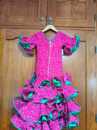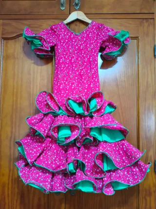 Vestido de flamenca para niña con un alegre estampado de flores. Ideal para fiestas y eventos. - Mangas con volantes. - Falda con múltiples volantes.