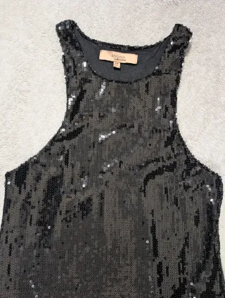 Vestido de fiesta con lentejuelas brillantes. Ideal para eventos especiales. Diseño sin mangas.