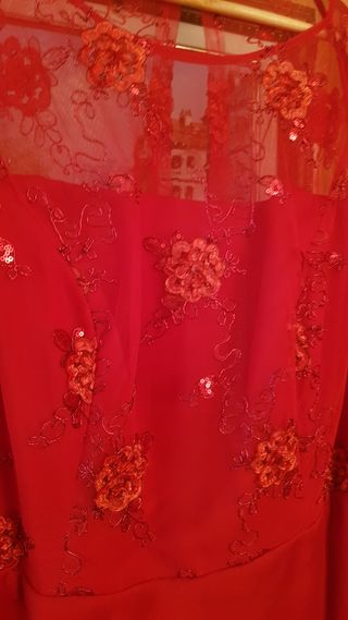 Elegante vestido de fiesta. - Diseño con detalles bordados. - Falda con vuelo.Es de manga corta , pero en la foto está con chal puesto.Si les interesa pedir más fotos sin compromiso.