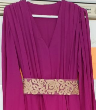 Vestido fiesta talla 38 o M de tejido tul, color buganvilla y con apertura en las mangas. Incluye cinturón bordado en dorado. Puesto 1 ocasión. Precio original tienda IOL Gijón: 120€.