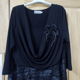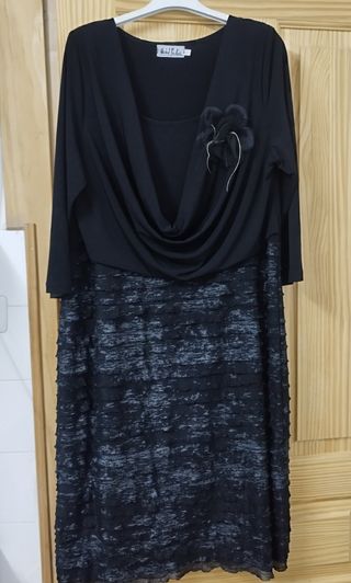 Vestido de fiesta negro, con manga larga y adorno de flor en la solapa, la parte de abajo van plisada en tonos grises y negros; es elástico. Puesto en una ocasión para una fiesta. Talla 46. En muy buen estado