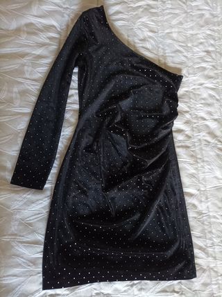 Vestido con escote asimétrico terciopelo negro con detalles plateados. Muy elegante. Está perfecto solo se ha usado una vez