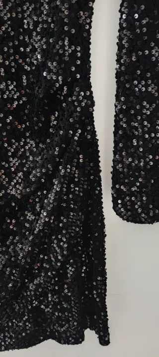 Precioso vestido de fiesta, ideal para una ocasión especial. ✨ - Escote en V. - Manga larga. - Confeccionado en una delicada tela con lentejuelas doradas sobre fondo negro. - Diseño entallado que se adapta a la figura. - Perfecto estado.