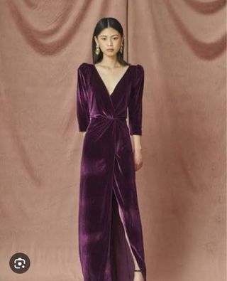 Elegante vestido de fiesta de terciopelo. - Color morado intenso. - Diseño drapeado. - Mangas abullonadas.