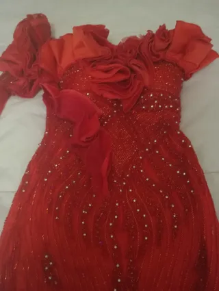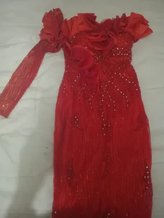 Elegante vestido de fiesta largo en color rojo, ideal para eventos especiales.venta fuera wallap...informacion al 722729573 (negociable) - Diseño con volantes en el escote. - Manga larga con detalles brillantes. - Adornado con pedrería y lentejuelas. - Corte ceñido que realza la figura.