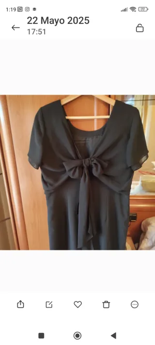 Vestido negro de encaje con forro interior Talla L-Xl Puesto en una ocasión Manga francesa Corte asimétrico Cierra en la espalda con una cremallera invisible (El vestido está en perfecto estado,el lazo que va en la cintura es de raso va independiente al vestido y se puede quitar habría que sustituirlo porque tiene zonas enganchadas y teñidas de negro )