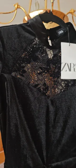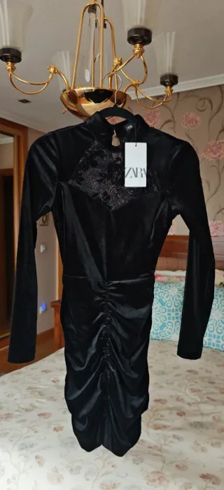 Elegante vestido de fiesta de Zara, perfecto para ocasiones especiales. Confeccionado en terciopelo y detalles de encaje.Elegantisimo vestido de fiesta o para salir arreglada,en color negro.Es de terciopelo y lleva encaje en la parte del pecho y una espalda preciosa con encaje.El encaje lleva terciopelo.Es divino,y sienta genial.Lleva cremallera en un costado.Drapeado por delante y por detrás.Talla S.Zara.Nuevo con etiquetas.La tela estira. - Diseño ajustado con fruncido. - Escote con detalle de encaje. - Manga larga.