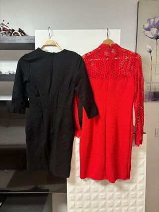 Conjunto de dos vestidos, uno negro y otro rojo, con diseños elegantes. - Vestido negro con escote pronunciado y manga larga. - Vestido rojo con cuello alto y detalles de encaje en mangas y escote.