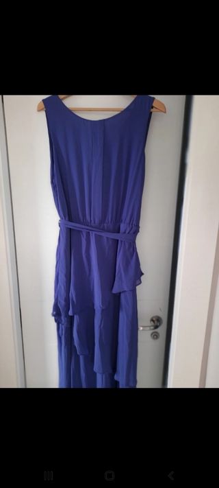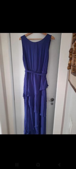 precioso vestido de fiesta en crepe azulón con varias capas haciendo volantes.con mucha caída. esta arrugado de estar colgado ya que es muy largo.es de mango.una L que equivale a una 42/44 nuevo con etiquetas. no fui a la boda !!