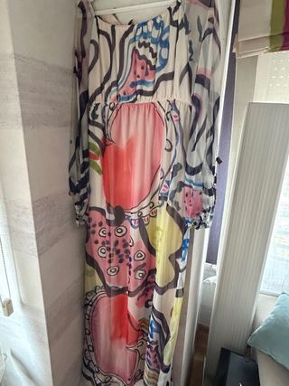 Precioso vestido largo ideal para una fiesta. Es de color rosa y multicolor con un estampado floral precioso. - Diseño de cuello en V. - Manga larga. - Cierre de lazo en la cintura. - Tejido fluido y ligero.