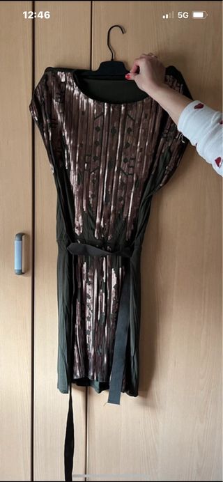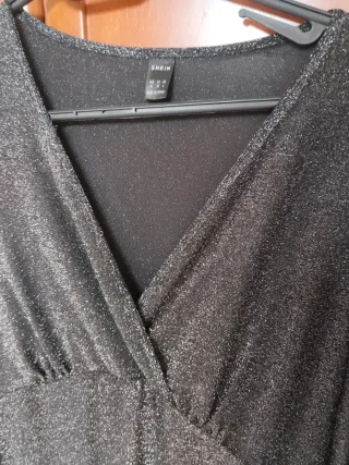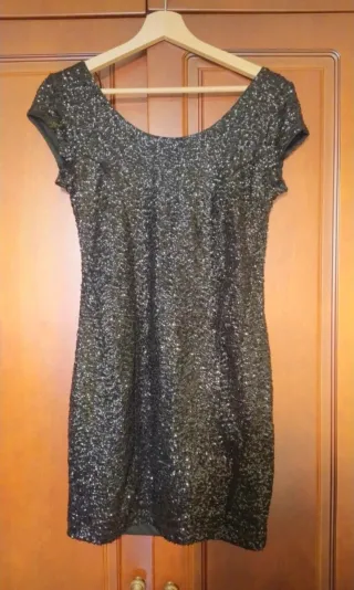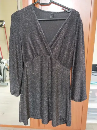 Elegante vestido con un diseño de brillos que capta la luz. - Talla S amplia, elástico ( llevo una 38) - Manga corta. - Cuello alto.