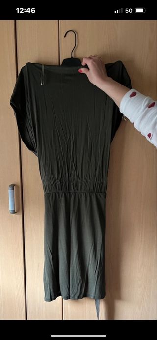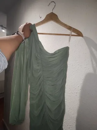 Vestido elegante de color verde, ideal para eventos especiales. Presenta un diseño de una sola manga larga y un favorecedor drapeado. - Diseño de una manga larga. - Drapeado frontal. - Tejido ligero y fluido.