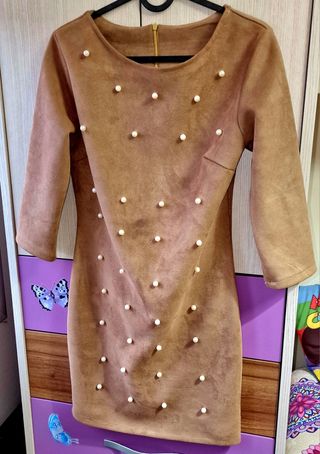 Vestido corto color beige. Manga 3/4. Cierre trasero de cremallera. Perlas por toda la zona delantera. Calentito para el invierno gracias a la propia tela del vestido que lleva interior estilo polar. Ideal para cualquier evento en Otoño e Invierno. Perfecto para bodas, bautizos, fiestas, etc.