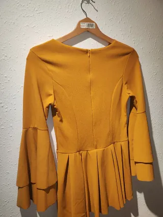 Vestido de fiesta en color amarillo vibrante, con un diseño elegante y moderno. Estira mucho - Mangas largas acampanadas. - Falda con pliegues. - Cremallera en la espalda.