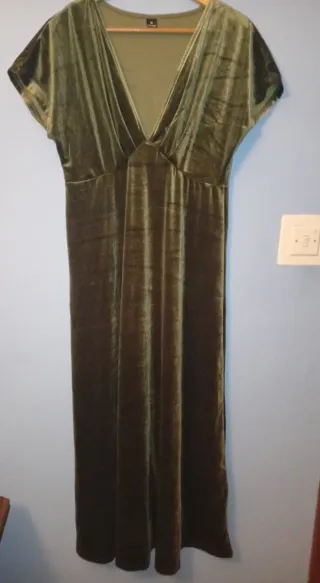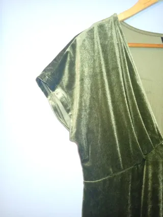Vestido largo de fiesta en color verde, confeccionado en terciopelo. - Tejido: Terciopelo. - Largo: Hasta los tobillos. - Escote: Pico. - Mangas: Cortas.