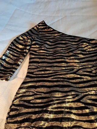 Vestido de fiesta con un llamativo estampado de cebra en lentejuelas. - Diseño de un solo hombro. - Manga larga en un lado. - Acabado brillante y festivo.