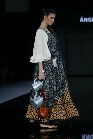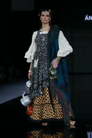 Vestido desfile camineras. SIMOF 2026. ideal para romerías y fiestas flamencas. Un diseño único .Es un vestido enterizo de capa . La parte de arriba perforada y la de abajo de lunares de tela fresca, en algodón. A estrenar . Solo este desfile. En talla 38 40 . Tiene bastante para sacar . Se puede usar sin delantal tb - Estampado floral y de lunares. - Mangas acampanadas con volantes. - Detalle de encaje. - delantal incluido.