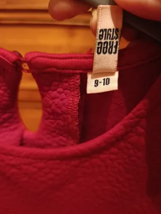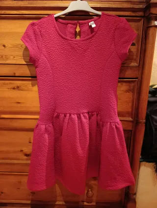 Vestido de fiesta para niña talla 9-10 años ,en color rosa con reflejos rojos, o rojo con reflejos rosa. Ideal para celebraciones. Unos 34 cms del hombro a cintura y unos 33 cm de cintura a abajo. Prácticamente nuevo. - Diseño con textura. - Manga corta. - Falda con vuelo.