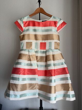 Vestido de fiesta para niña de la marca Tizzas. Presenta un diseño de rayas horizontales en varios tonos. - Diseño a rayas. - Mangas cortas. - Cintura marcada.