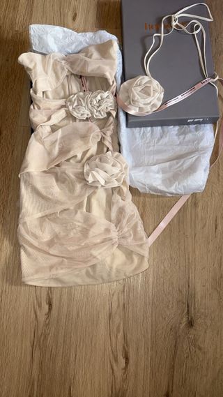Texto: vestido de la marca luxury londinense HouseCB . Modelo caterina .Talla XS. color Fog. Valorado en 235€. Sin estrenar. Es un vestido corto (mini) de estilo romántico y ajustado al cuerpo.Se caracteriza por ser "strapless" (sin tirantes) y cuenta con detalles fruncidos que estilizan la figura.ideal para cenas románticas, noches de fiesta . Muy elegante. Se vende por 40€