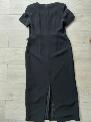 Elegante vestido largo de fiesta en color negro. Presenta un diseño con detalles de cinta satinada y adornos dorados en la cintura, ideal para una ocasión especial. - Cierre de cremallera invisible en la espalda. - Talla 42-44. - Diseño clásico y favorecedor. - Tejido de calidad, con buen caída. - Perfecto para eventos de noche. - Un único uso para una ocasión especial. - En perfecto estado. Medidas: Largo 128,5cm Ancho hombros 41cm Ancho de sisa a sisa 53cm Ancho cintura 43 Ancho cadera 54 Hago envíos, también se puede recoger en calle Jaime el Conquistador (28045, cerca de los metros Legazpi y Delicias).