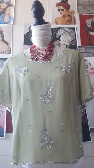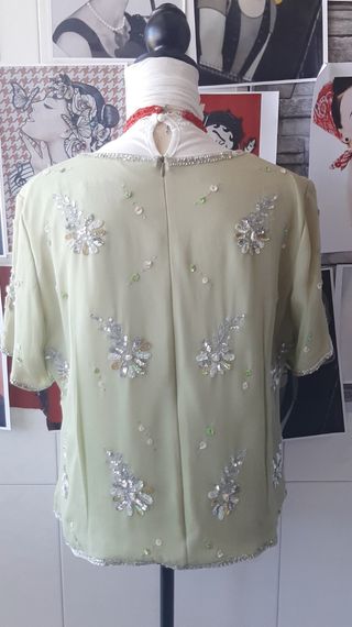 Festivo pero ponible, sirve para fiesta, evento, nochevieja, como noches de verano. Tejido flojito, lleva forro. Los círculos del bordado no son cristal, son como chapitas. Con un cinturón ancho también resulta. Importado por el Corte Inglés, no conserva etiqueta de marca ni de talla, debe ser talla S. Medidas: de sisa a sisa 42cm, Largo de falda 44cm, cintura 30,5cm, pero estira bastante más, aberturas laterales 8,5cm. Tiene una pequeña tara en la espalda bajo del escote, de unos 5mm, alguien mañoso lo resuelve bien, por eso el precio, ver última foto. ➕ cosas en mi perfil
