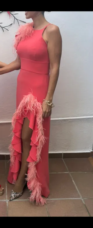 Elegante vestido largo de fiesta en tono coral, perfecto para eventos especiales. - Diseño asimétrico con detalle de plumas. - Corte con abertura lateral. - Escote halter. Lo utilice para una boda especial el coste original fueron 570euros lo vendo por 300. No puede ser las bonito ademas de una tela buenisima que ajusta sin marcar. Fue todo un acierto