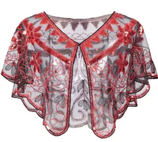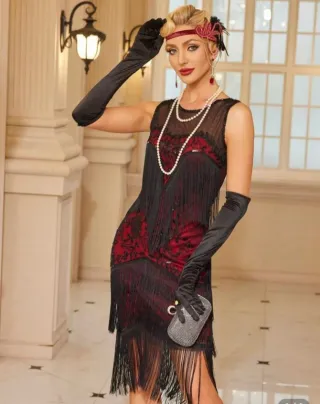 Vestido de época inspirado en los años 20(charleston), con un diseño llamativo. -Con complementos,+ un Chal con lentejuelas,y cuentas -Una diadema, a conjunto con pluma metalica. -Tambien guantes color rojo. -Poco usado. - Perfecto para fiestas y eventos. - Detalles de flecos. - Encaje intrincado. - Combina rojo y negro.