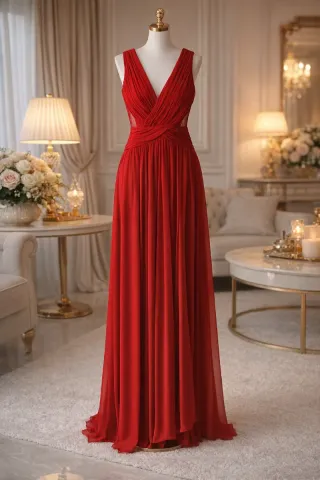 Elegante vestido de fiesta largo. - Diseño con escote en V. - Detalle de pedrería en la cintura. - Pliegues en la parte superior.