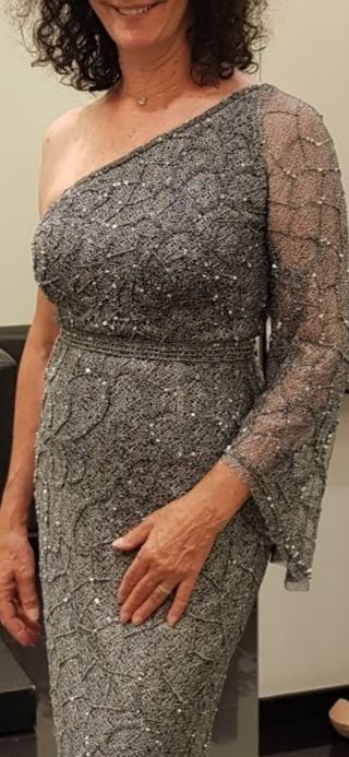 Vestido fiesta largo. asimétrico con corte de sirena y manga abullonada. Talla 36 Nuevo con etiqueta y sin ningún arreglo.