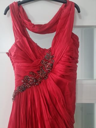 Precioso vestido de fiesta de la marca ROSA CLARA. Es de color rojo y tiene unos detalles de pedrería preciosos. - Talla: (Añadir talla) - Confeccionado en un tejido de seda ligero y fluido. - Ideal para eventos especiales. Su precio fue de 700.