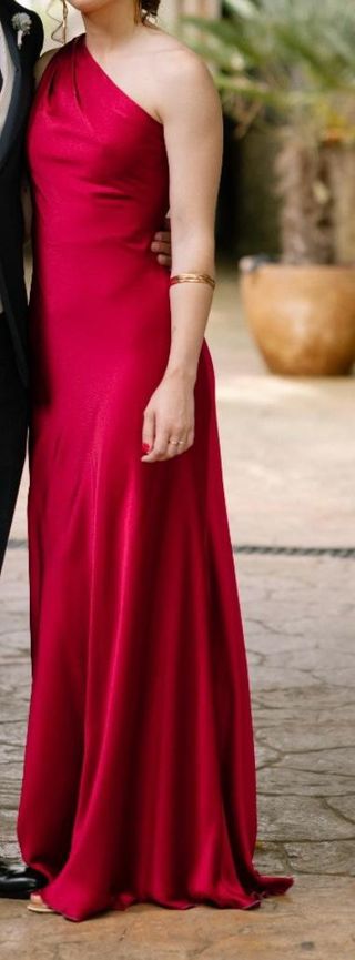 Precioso vestido largo de Rosa Clará, color rojo. Es de un solo hombro y tiene una abertura en la espalda. El tejido es fluido y elegante, ideal para una ocasión especial. Puesto una vez para una boda, está como nuevo. Vestido de la colección de 2025 de fiesta de la prestigiosa diseñadora Rosa Clará. - Talla: 34 (altura 160) - Estilo: Largo, asimétrico