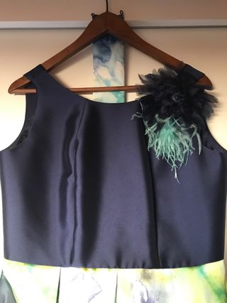 Vestido de invitada de boda o evento talla 40. Cuerpo azul marino y el resto en estampado floral. Cinturón a juego. Broche a juego. Chal de gasa o tul azul marino. Puesto en una ocasión. Precio original 499€. Se entrega en su funda.