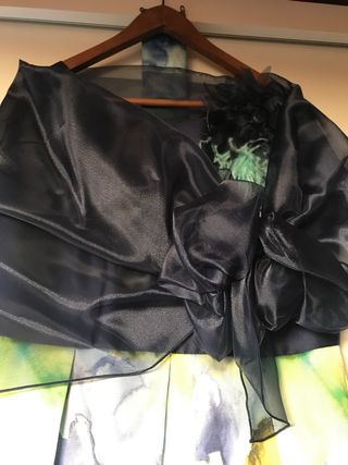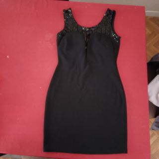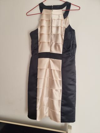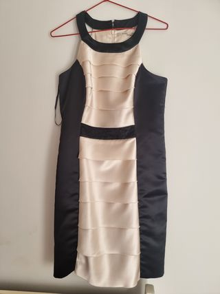 vestido de fiesta. en color negro y champan. Queda precioso puesto. talla L. talla poco como una 38/40. raso con banda negra de pedrería.