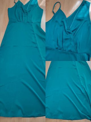 Vestido nuevo sin estrenar, talla L. Diseño elegante y minimalista en satinado verde esmeralda, con un precioso brillo suave que realza la figura. Cuenta con escote cruzado en V, ideal para ocasiones especiales o cenas de verano. Corte ligeramente entallado en la cintura y falda de caída fluida que aporta movimiento y un toque sofisticado. ✨ Estado: nuevo, sin estrenar 📏 Talla: L 🎨 Color: verde esmeralda 🌿 Estilo: elegante, femenino y versátil (perfecto para eventos, fiestas o una salida especial) Las medidas son: largo: 147 cm pecho: 92 cm contorno cintura: 80 cm