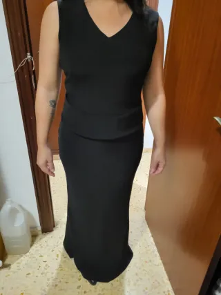 Elegante conjunto de fiesta de la marca One Saint Fiene, en color negro y talla L/40/12. - Incluye top y falda. - El top tiene un bonito detalle plisado en el pecho. - La falda es cruzada/ drapeada. - Perfecto para una ocasión especial.