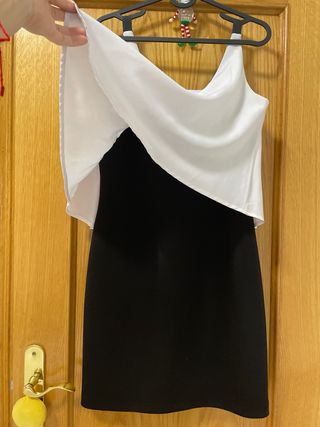 Elegante vestido de dos piezas, ideal para eventos especiales. La parte superior es de color blanco y la inferior de color negro. usado 2 veces para eventos - Diseño de tirantes finos. - Capa superpuesta en la parte superior. - Falda recta.