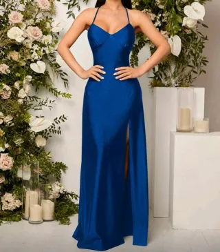 Elegante vestido de fiesta largo en color azul. Ideal para eventos especiales. Talla M. - Diseño con tirantes finos. - Abertura lateral pronunciada. - Corte que realza la figura.