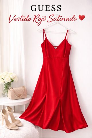Elegante vestido rojo de GUESS con un diseño femenino y muy favorecedor. Perfecto para una fiesta, una cita, una cena elegante o una ocasión especial. El vestido tiene una caída ligera y fluida que realza la silueta y se mueve красиво al caminar. La tela es poliéster de tratamiento especial con acabado satinado, muy suave al tacto y similar al aspecto de la seda natural, lo que le da un look elegante y lujoso.