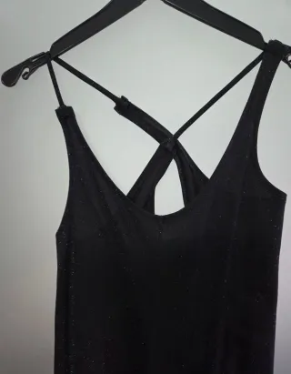 Vestido negro con detalles brillantes, ideal para fiestas. - Diseño con escote halter. - Tejido elástico y cómodo. - Acabado con pequeñas lentejuelas. - Parte lateral abierta Está nuevo (La tela es delicada y puede tener hilitos suelto , a mi parecer no se nota), solo lo compré para Nochevieja. Queda muy bonito puesto y estiliza mucho. Talla M. Entrega en Sevilla o envío.