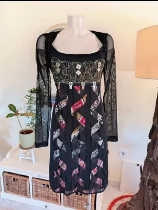 Vestido original de la marca italiana Save the Queen, diseño muy especial con bordados, detalles metálicos y mangas transparentes. El vestido tiene un estilo muy artístico con estampado patchwork y diseño exclusivo en la espalda. Fabricado en Italia con mezcla de polyester, nylon y elastano, cómodo y ligero. Ideal para evento, fiesta, festival o estilo boho / alternativo. Estado: muy bueno. Talla: L.