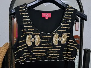 Vestido negro con lentejuelas y piezas pequeñas doradas, tipo charleston años 20. Pesa y sienta muy bien. Lo compre en Moda Joven de El Corte Ingles pero le quite la etiqueta porque algunas me pican. He ido a 2 bodas con el. Esta nuevo Podria valer a una talla S y M